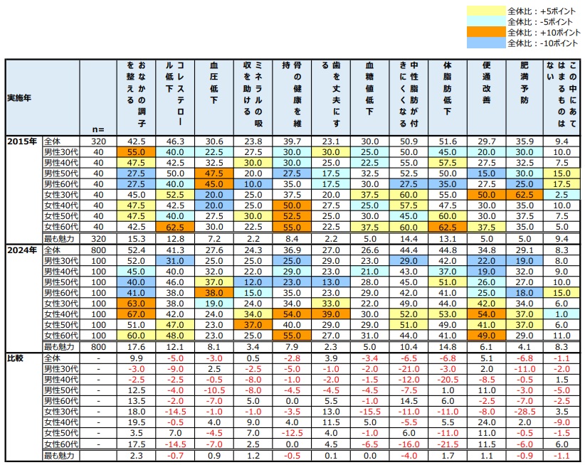 全体で見ると、魅力を感じる効果として、2015年のTOPとやや異なり、「おなかの調子を整える」約52%、「体脂肪低下」約45%、「中性脂肪が付きにくくなる」約44%となった。比較表は下表。