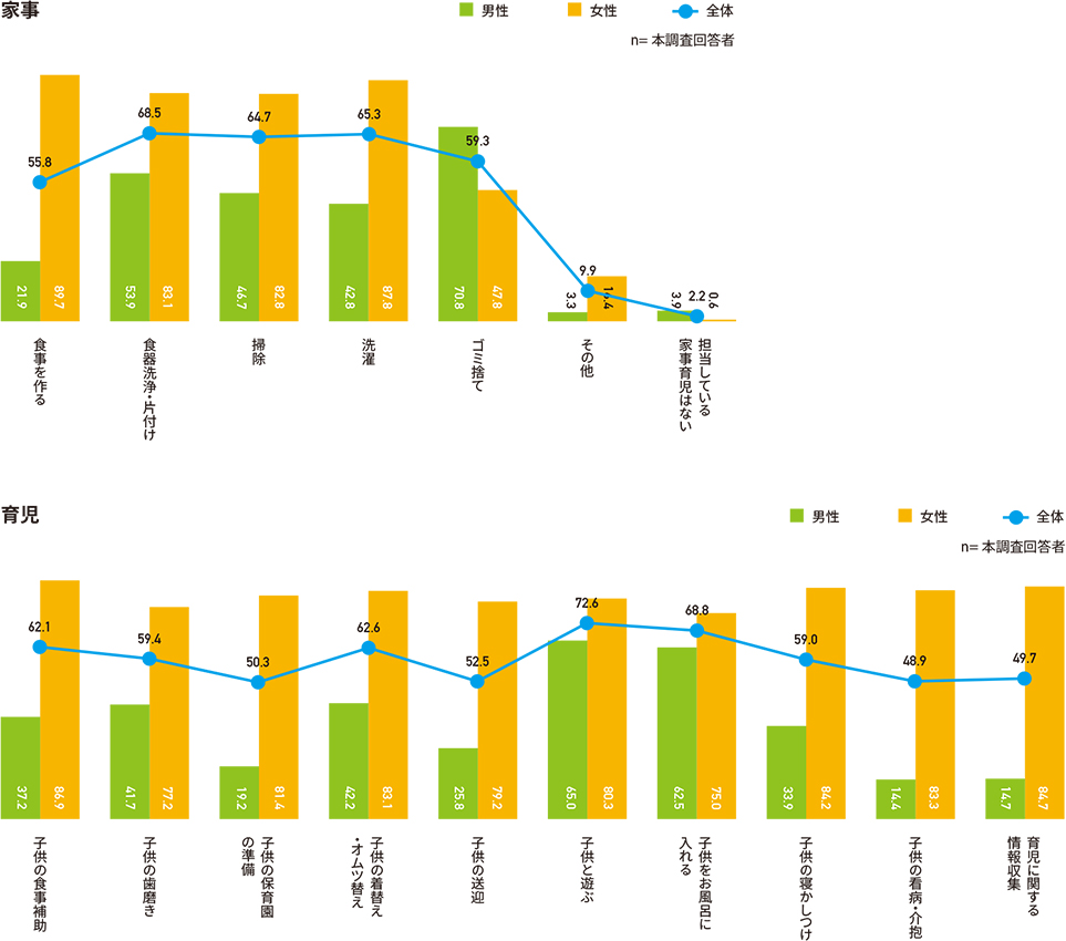 「ゴミ捨て」を除き、ほぼ全ての家事育児において女性がメインで担当しており、その差分も大きい。中でも男女の差分が大きい家事育児は「育児に関する情報収集」「子供の看病・介抱」、逆に差分が比較的小さい家事育児は、「子供と遊ぶ」「子供をお風呂に入れる」のみ。