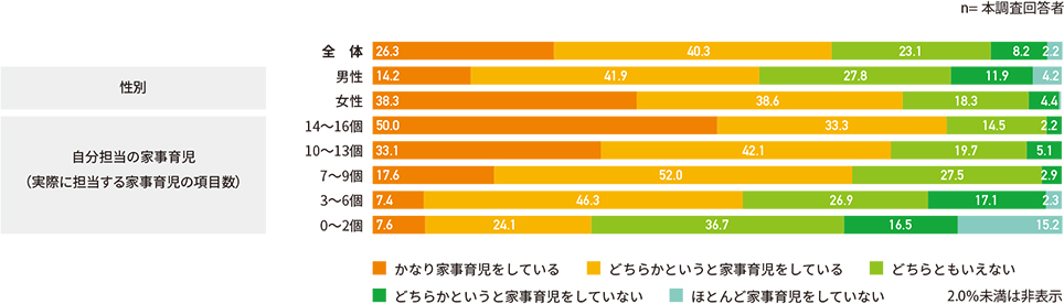 女性の3人に1人以上が自身を「かなり家事育児をしている」と評価、男女間で大きな開きがみられる。