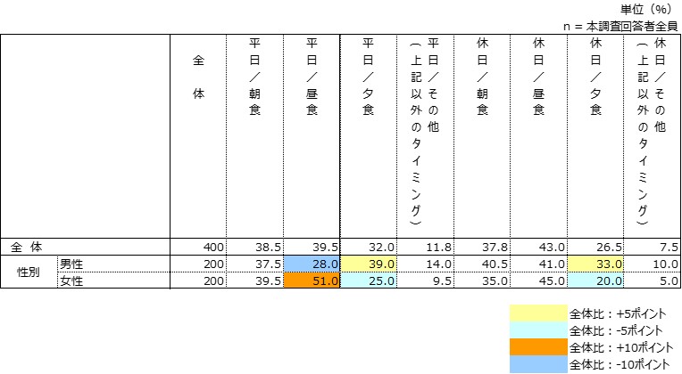 また、2番目の平日/昼食は、男性が28%、女性が51%と性別で差がみられた。平日/夕食と休日/夕食でも男性と女性で差が見受けられ、男性の方がそれぞれ14pt、13pt高かった。