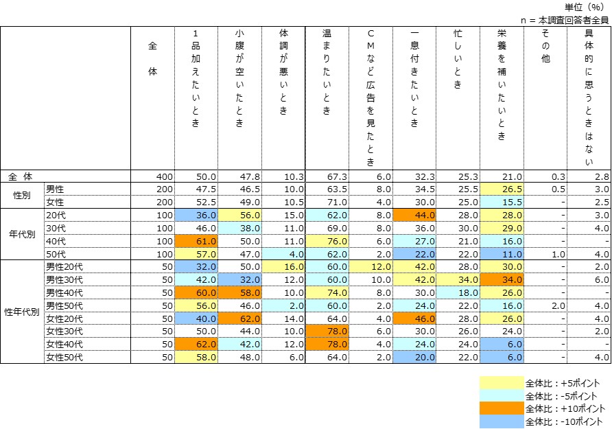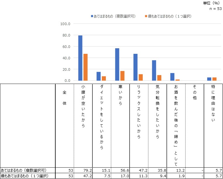 また、1位の「小腹が空いたから」と2位の「寒いから」の差は、「あてはまるもの」では約23ptとなり、「最もあてはまるもの」では約30ptとなり、さらに差が開いた。
