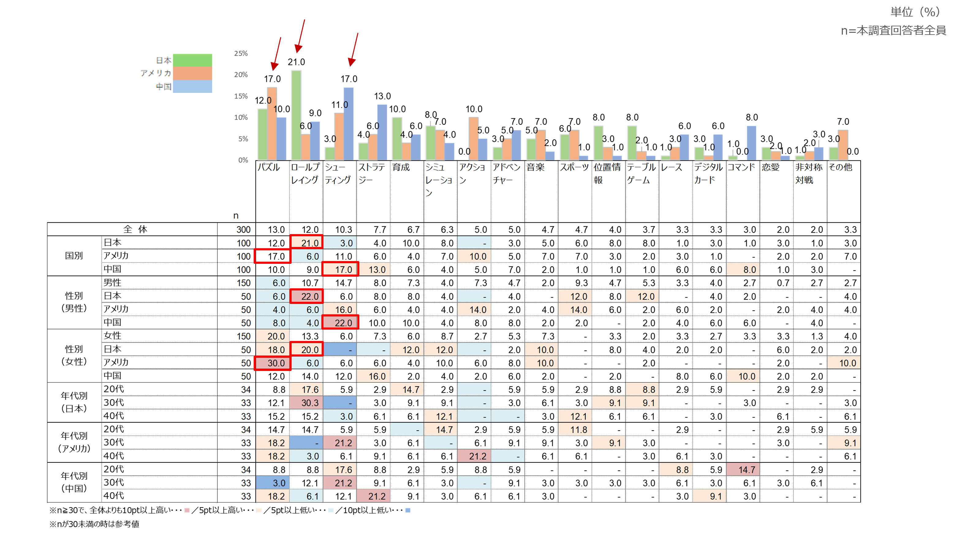 - 各国の人気ジャンル、日本は「ロールプレイング」、アメリカは「パズル」、中国は「シューティング」