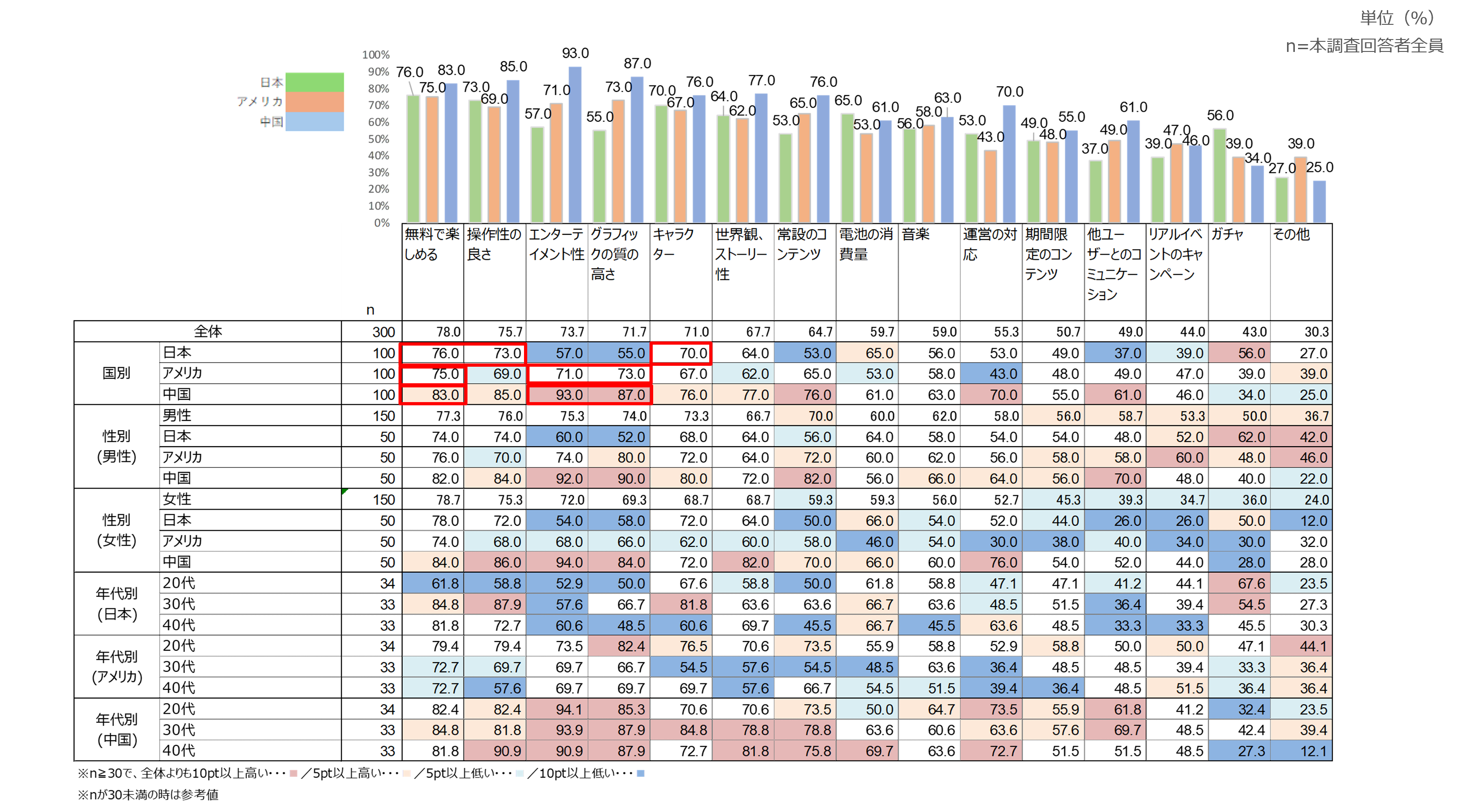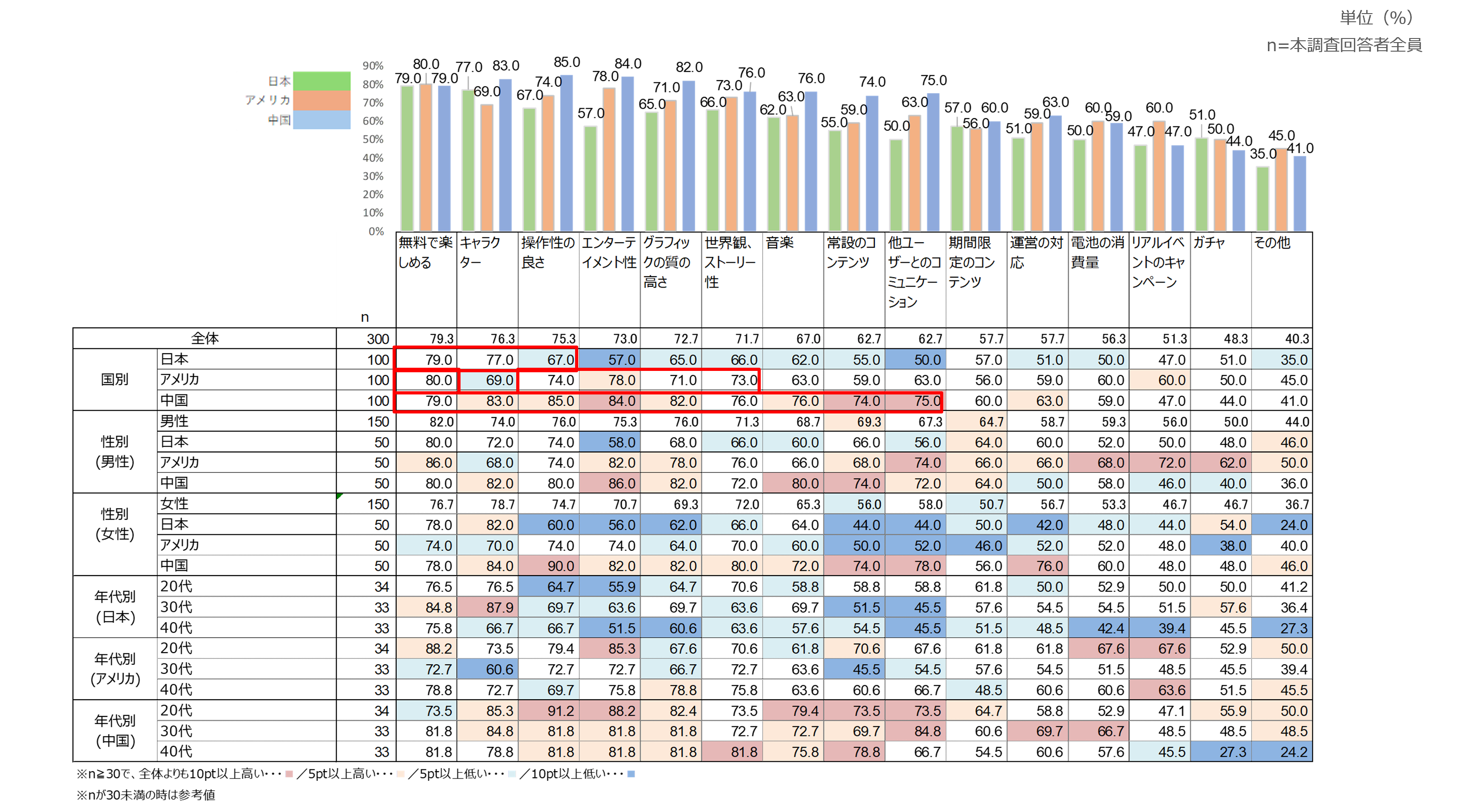 アメリカは、「無料」がトップで、「エンターテイメント性」、「操作性の良さ」、「世界観・ストーリー性」、「グラフィックの質の高さ」が7割以上。中国は「操作性の良さ」、「エンターテイメント性」、「キャラクター」、 「グラフィックの質の高さ」が8割以上で、満足度が総じて高かった。