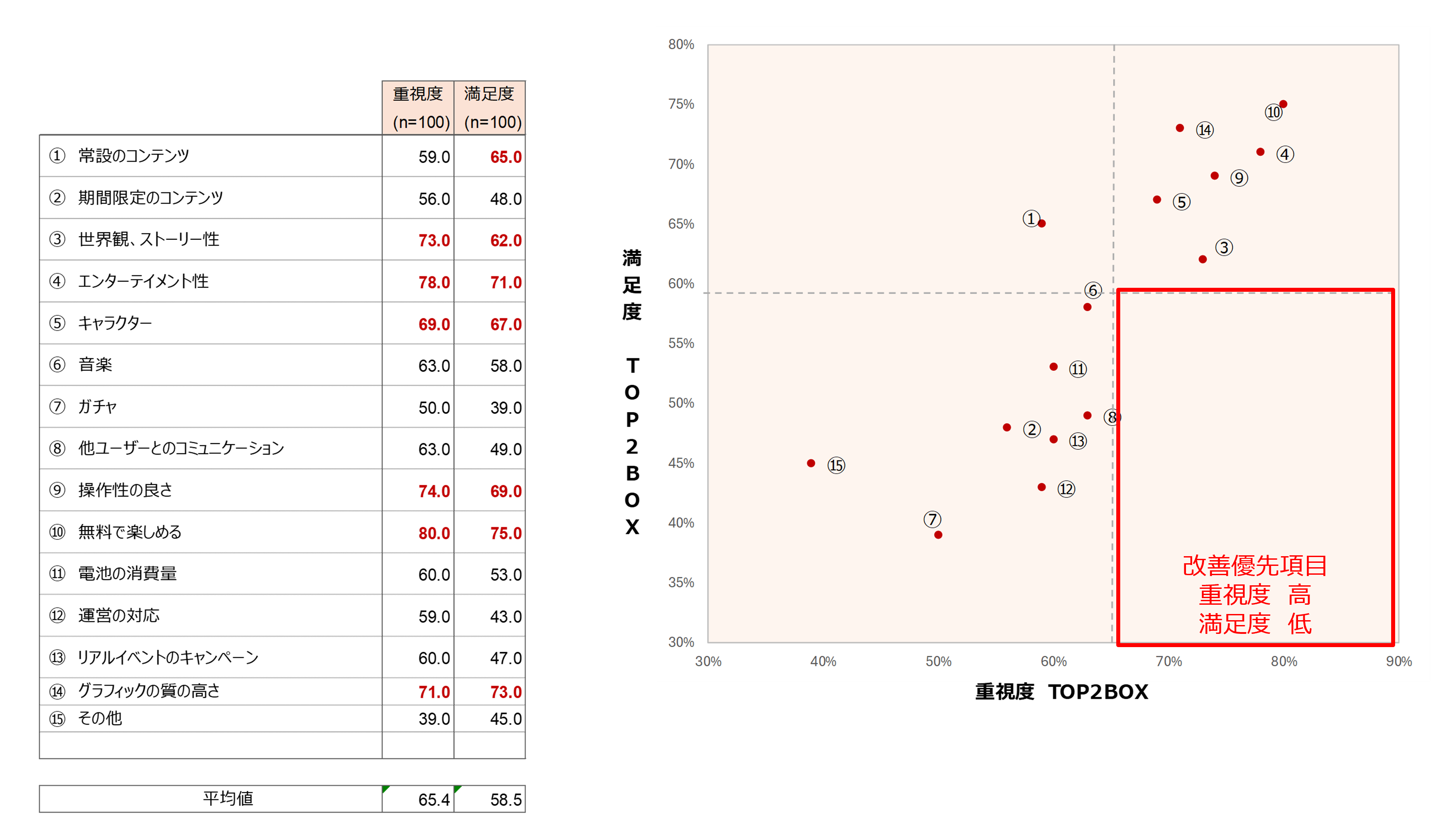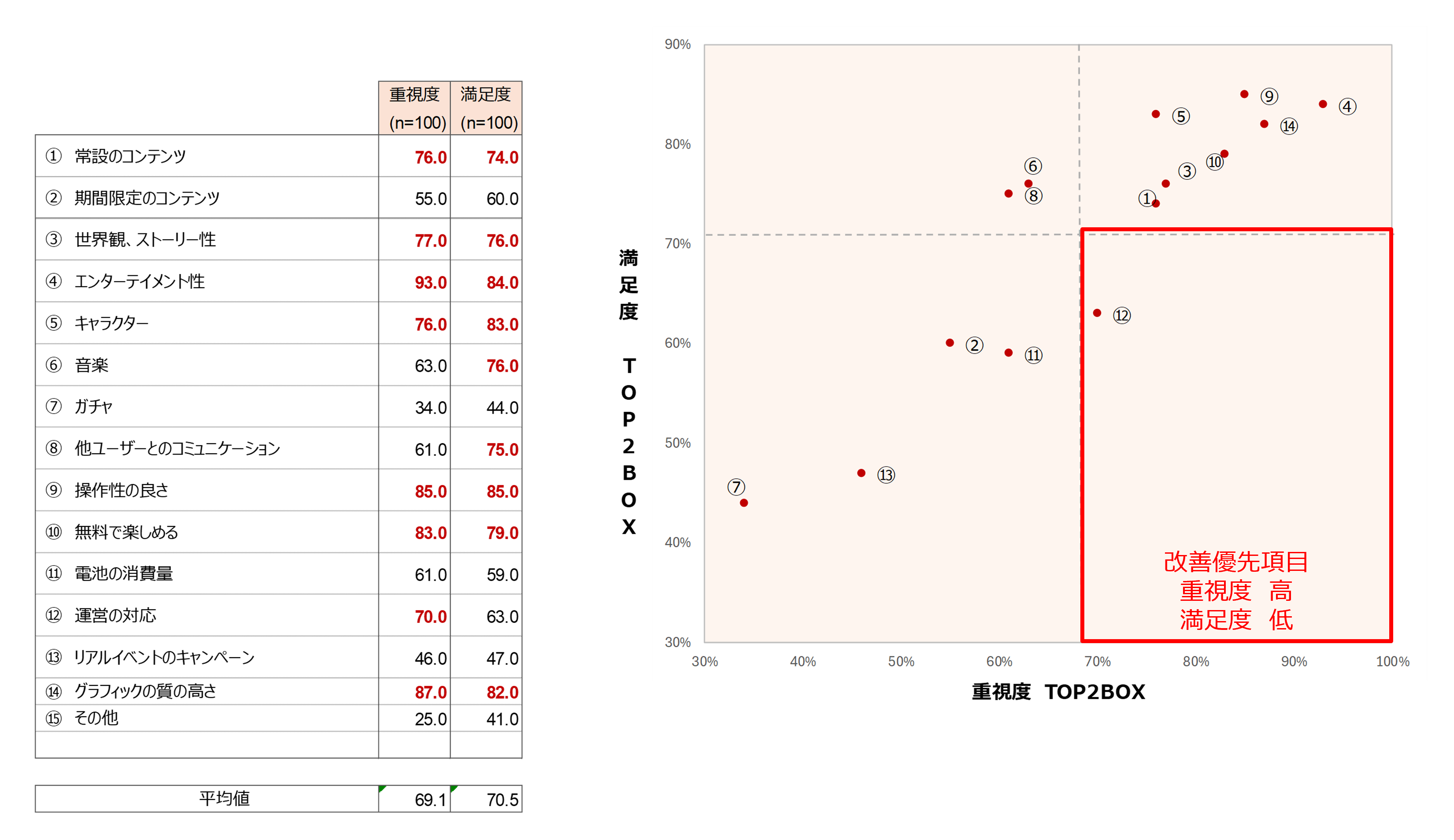 - 優先改善項目(重視度が高く、満足度が低い項目)、日本は電池の消費量、アメリカは特になし、中国は運営の対応