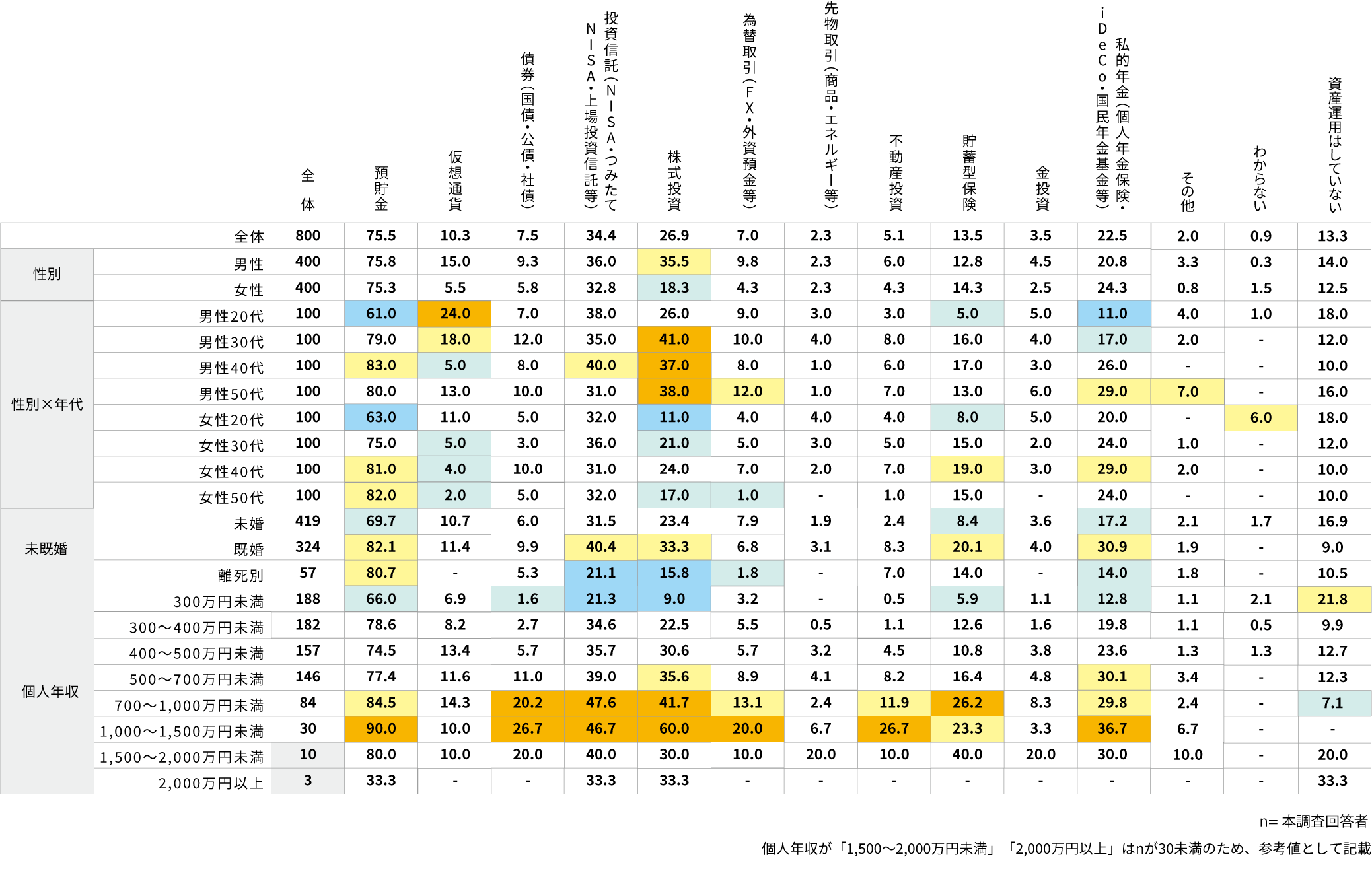 - 資産運用「預貯金」が7割以上、次いで「投資信託(NISA・つみたてNISA・上場投資信託等)」「株式投資」の順