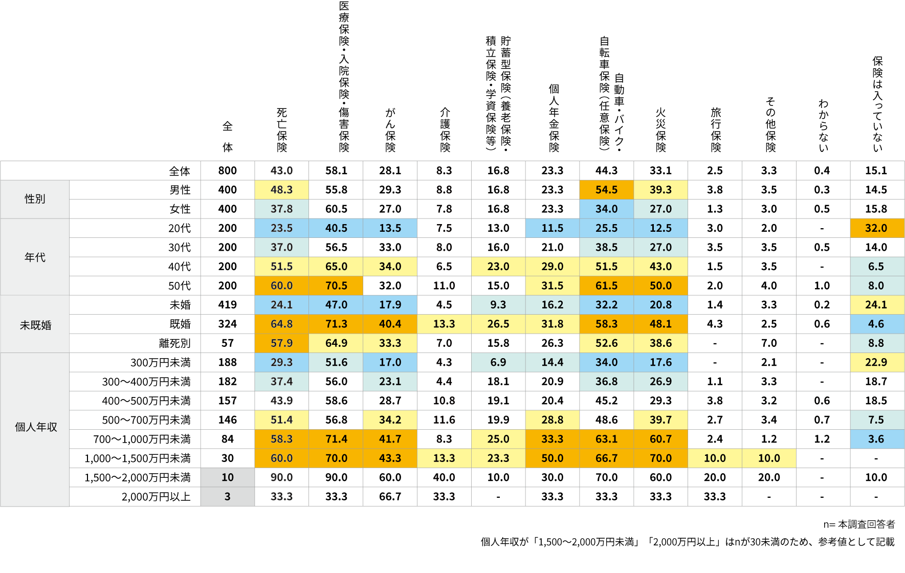 今回は、全国20-50代の有職者の男女に、実際の資産運用、加入している保険内容も含めて、金融・保険のリテラシーについてのアンケートを性年代別・未既婚別・個人年収別で比較し、調査しました。