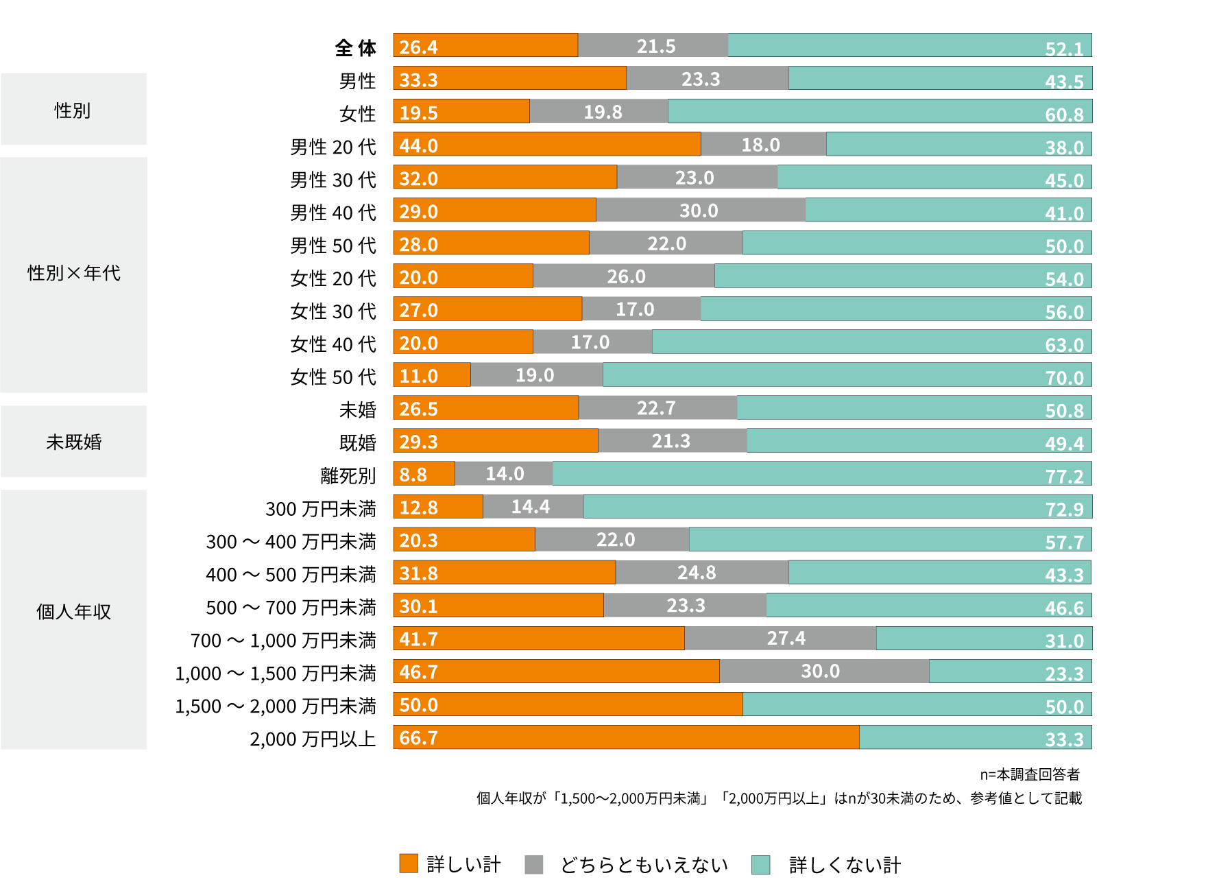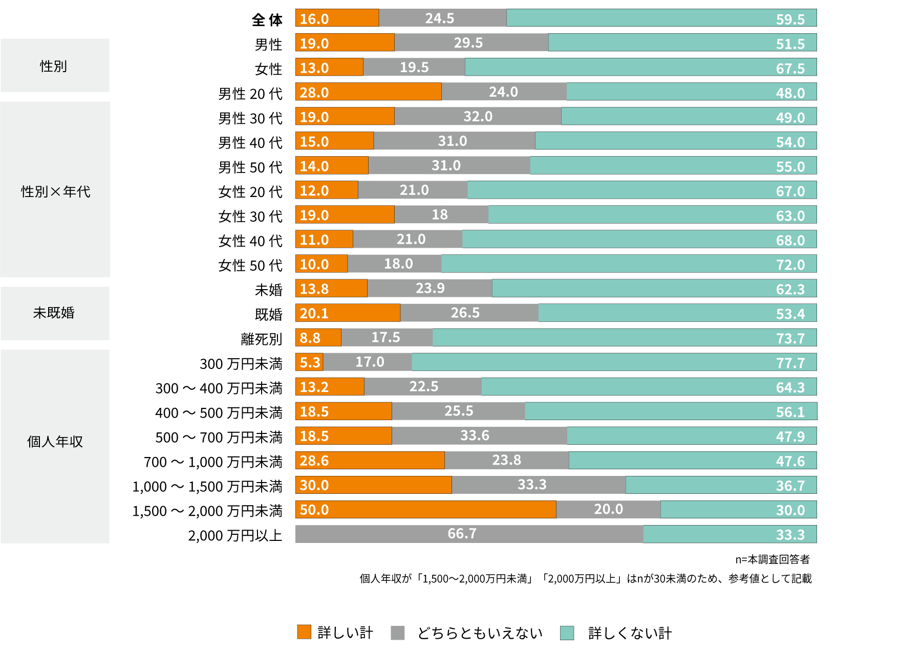 また、個人年収が高いほど、「詳しい(計)」と答える層が如実に増える傾向がみられる。
