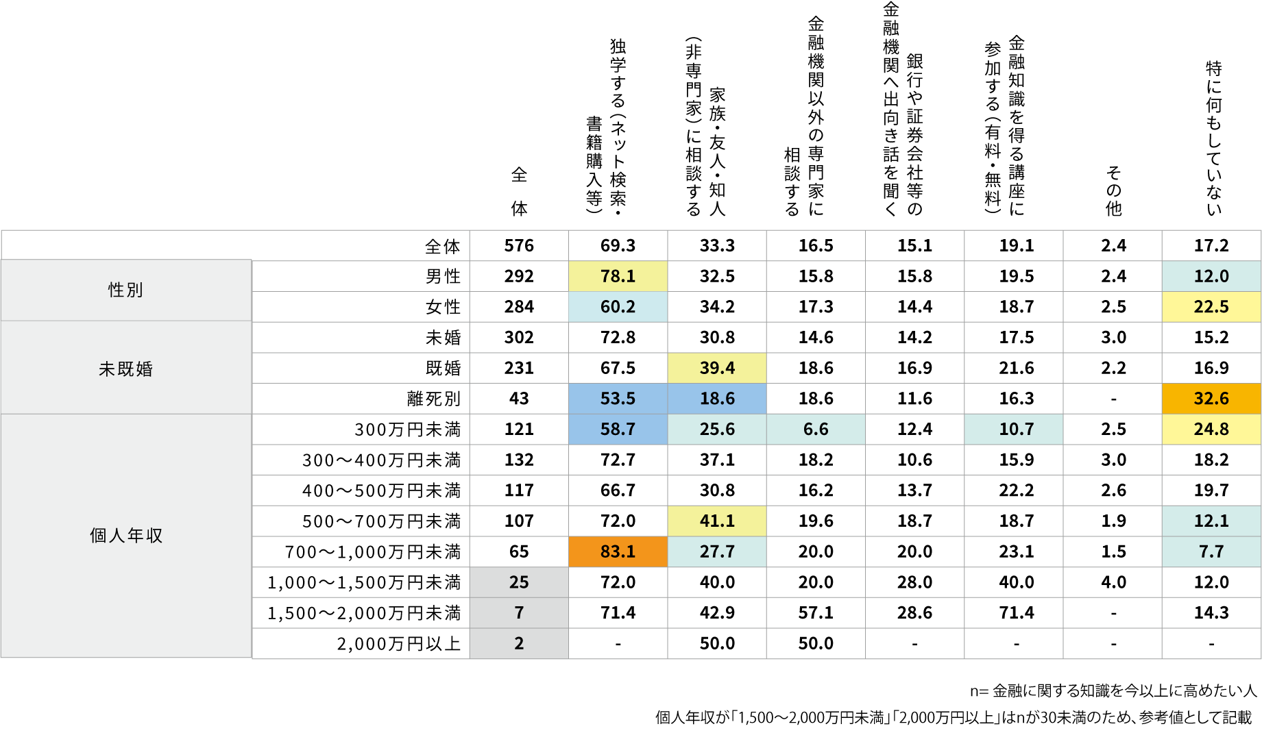 個人年収別では、300万円未満の層で他の層と比べ、「独学する(ネット検索・書籍購入等)」割合が低く、「特に何もしていない」割合が高くなる。一方、700~1,000万円未満の層で、「独学する(ネット検索・書籍購入等)」割合が高くなる。