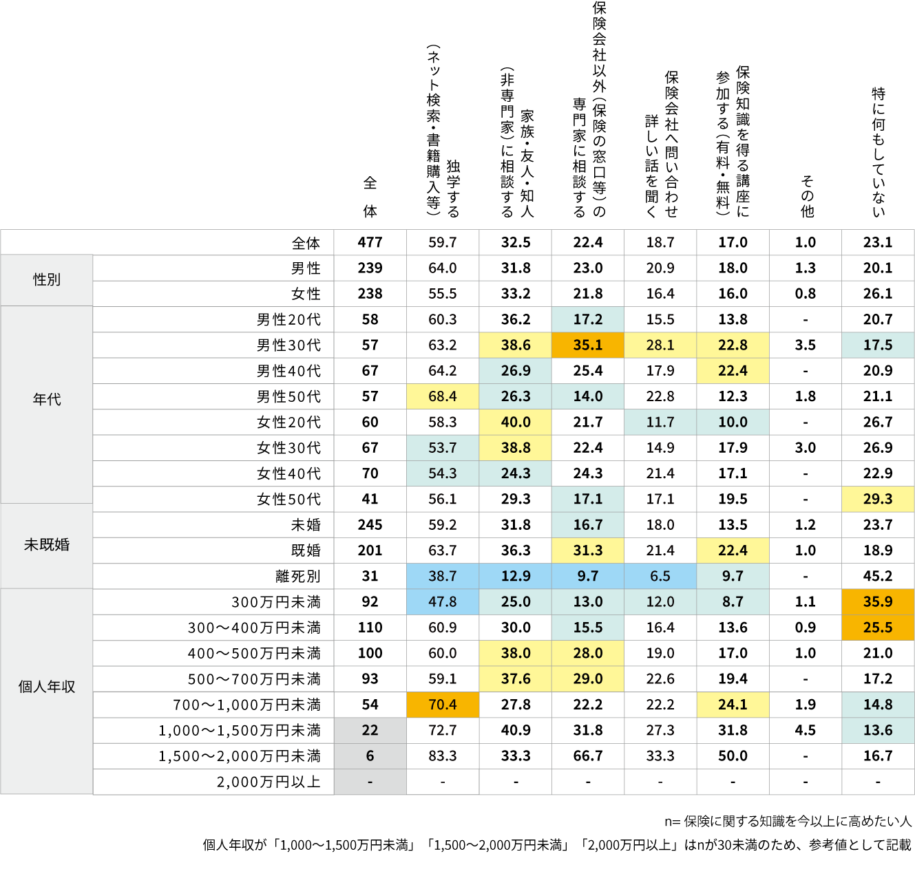 「保険会社以外(保険の窓口等)の専門家に相談する」は30代男性で如実に高くなる。