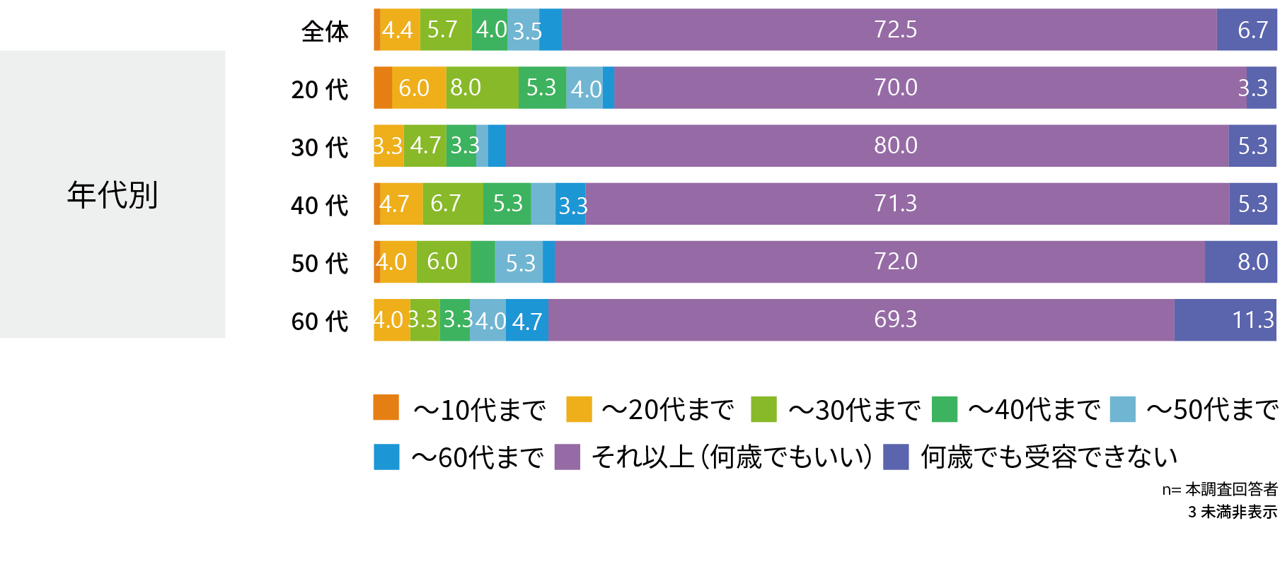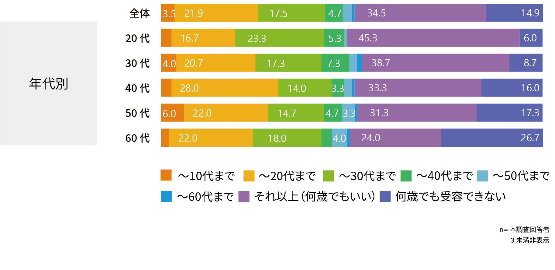 20代女性のみ、「~30代まで」も2割以上が受容できると回答している。