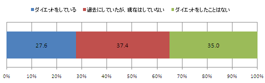 全員に対し現在ダイエットを行っているかたずねたところ、「過去にしていたが、現在はしていない」が37.4%と最も多く、過去に何かしらのダイエット経験がある人が4割近くいた。