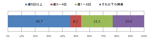 仕事・仕事以外のいずれかで電車(東京メトロ)を利用していると答えた人に対し、利用頻度を聞いた。「週5日以上」が45.7%で最も多く。次いで「週1~2日」が23.2%、「それ以下の頻度」が23.0%となった。