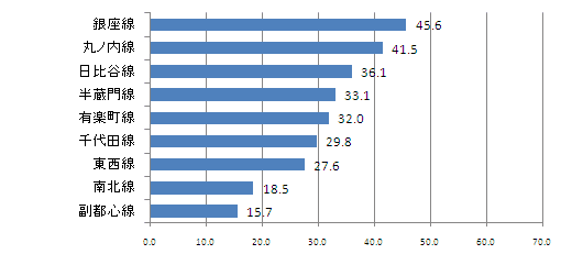東京メトロを週に1回以上利用すると回答した568人に、普段利用している路線を回答してもらった。「銀座線」が45.6%で最も多く、「丸ノ内線」41.5%、「日比谷線」36.1%、「半蔵門線」33.1%、「有楽町線」32.0%と続いた。