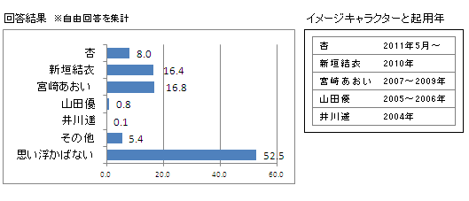 全体の52.5%が「なし」(思い浮かばない)という結果に。42.1%の人がいずれかのタレント名を回答した。イメージキャラクターを務めた期間が一番長い「宮崎あおい」さん(2007年~2009年)が16.8%で最も多く、昨年(2010年)の「新垣結衣」さんが16.4%でほぼ同率。また2011年5月から起用されたばかりの「杏」さんも、8.0%の人が回答している。尚、「その他」5.4%には、名前がわからない・忘れたといった回答と、イメージキャラクターではない人物の回答を含んでいる。