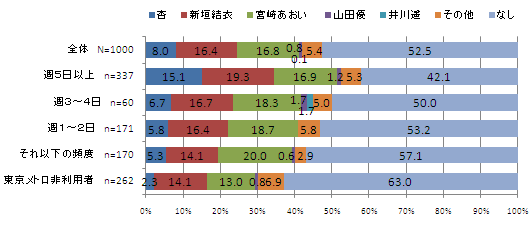 東京メトロの利用頻度別で見ると、利用頻度が高いほどタレント名の記入率が高かった。利用頻度が「週5日以上」の人では、今年のイメージキャラクターである杏さんを回答した人が全体に比べて7.1ポイント高かった。