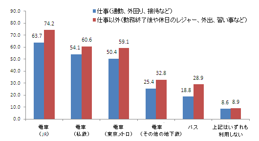 東京都23区内で働くビジネスパーソン1,000人に、普段利用している交通機関(鉄道・バス)を聞いた。仕事・仕事以外共に「電車(JR)」が最も多く、次いで「電車(私鉄)」、「電車(東京メトロ)」となった。