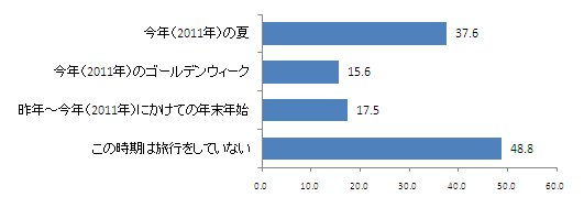 2011年の旅行(年末年始、ゴールデンウィーク、夏の3つの時期)について、行った時期を選択してもらった。「夏」が37.6%、「ゴールデンウィーク」が15.6%、「年末年始」が17.5%と、夏に行った人が最も多い結果となった。3つの時期のいずれも行っていない人は48.8%だった。