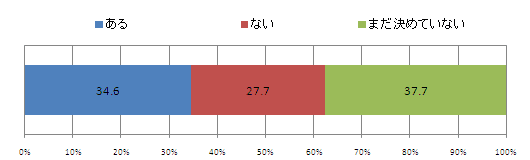 今年の 秋に旅行の予定があるかどうか聞いたところ、「ある」が34.6%、「ない」が27.7%、「まだ決めていない」が37.7%となった。