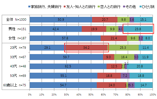 予算に続いて、誰と一緒に行くかをたずねたところ、「家族旅行、夫婦旅行」が50.9%と最も多く、次いで「友人・知人との旅行」が20.7%、「ひとり旅」が15.1%、「恋人との旅行」が9.8%と続いた。男女別で見ると、男性は全体に比べて「ひとり旅」の割合が高く、23.8%。年代別では、20代だけが「友人・知人との旅行」が最も多く、34.2%と3割を占めた。