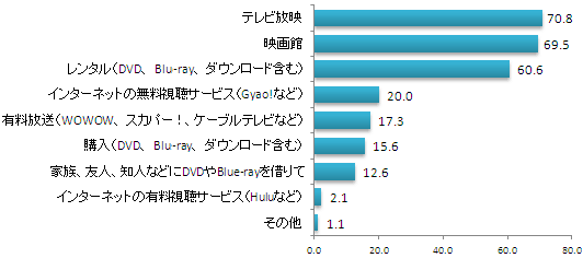 映画を「よく観る」または「たまに観る」と回答した人に、普段どのような方法で観ているのか選択してもらった。「テレビ放映」が70.8%で最も多く、次に多いのが「映画館」で69.5%、「レンタル」が60.6%だった。「映画館」と「レンタル」は年代が上になるほど選択率が低くなっており、60代以上では「テレビ放映」が最も多かった。