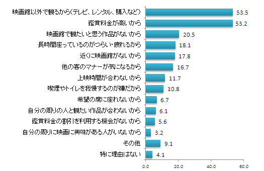 映画は観るが、映画館には行かないという人にその理由を回答してもらった。「映画館以外で観るから」が53.5%で最も多く、0.3ポイント差で「鑑賞料金が高いから」が53.2%となった。この二つが主な理由となっている。続いて「映画館で観たいと思う作品がないから」が20.5%、「長時間座っているのがつらい・疲れるから」が18.1%、「近くに映画館がないから」が16.7%となった。「その他」の具体的な回答としては、子供がいるから、子供が小さいから、というものが多かった。