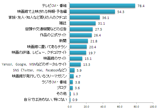 作品を選ぶ時の情報源として、重視しているものを5つまで選択してもらった。最も多かったのは「テレビCM・番組」で78.4%。次が「映画館で上映される特報・予告編」で54.3%、「家族・友人・知人など周りの人のクチコミ」が36.1%、「雑誌」が31.1%となった。