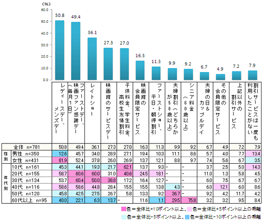 今までに利用したことがある鑑賞料金の割引サービスを選択してもらった。最も多かったのは「レディースデー、メンズデー」で50.8%。ただし、メンズデーのある映画館は非常に少ないため、男女差が大きい。女性は81.9%と8割を超えているが、男性はわずか12.6%だった。