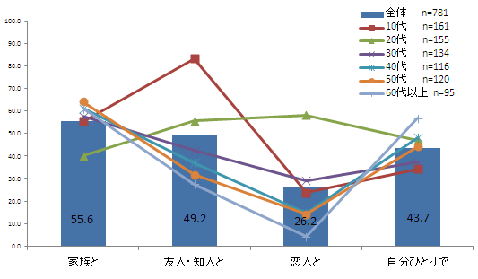 普段、誰と一緒に映画館で観ているか、複数選択式で回答してもらった。「家族と」が55.6%で最も多く、次に多いのが「友人・知人と」で49.2%だった。「友人・知人と」は年代が若いほど割合が高く、10代では8割が選択している。