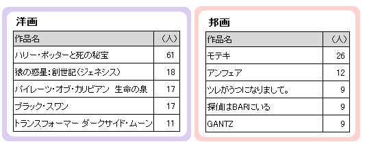 最近映画館で鑑賞した作品の中で、特に「好きな作品」または「面白かった作品」を記述式で回答してもらった。洋画と邦画、それぞれ回答の多かった作品をランキングにした結果は以下の通り。その他アニメやCG作品では、『コクリコ坂から』(21人)、『カーズ2』(7人)などがあげられた。