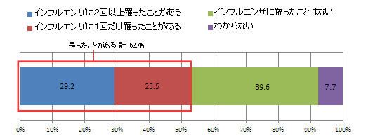 52.7%の人が「ある」という結果だった。そのうち2回以上罹ったことがあるという人は29.2%、1回だけ罹ったことがあるという人は23.5%。「ない」という人は39.6%で、「わからない」という人が7.7%だった。