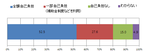 すでに受けた、または受ける予定と回答した人に、予防接種の費用について聞いた。過半数の52.5%の人が「全額自己負担」と回答。「一部自己負担」は27.6%、「自己負担なし」は15.0%、「わからない」が4.9%だった。