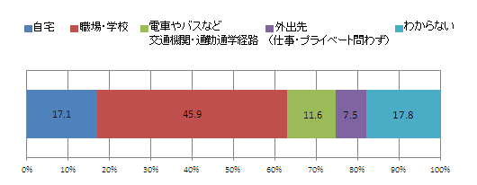 最も多かったのは、「職場・学校」で45.9%。次に多いのは「わからない」で17.8%だった。その他は「自宅」17.1%、「電車やバスなど交通期間・通勤通学経路」11.6%、「外出先」7.5%となっている。