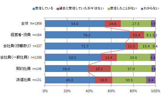 また、職業別に見ると、【経営者・役員】では「受信している」人の割合が最も高く76.2%で、【会社員(役職)あり】では72.7%と、それぞれ7割を超えている。【会社員(一般社員)】では、50.5%でほぼ半数だった。