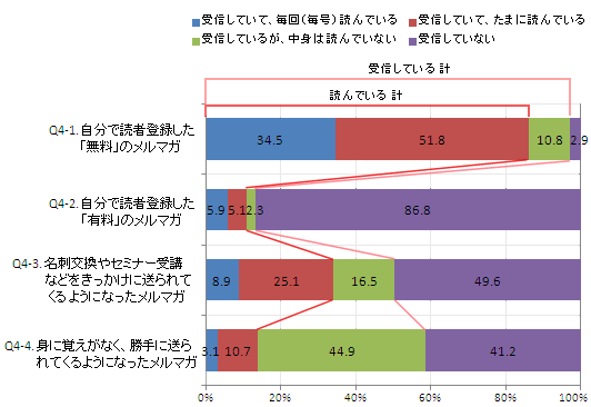Q4-1 【自分で読者登録した「無料」のメルマガ】は、受信している人が全体の97.1%と、非常に高い。また、そのうち中身を読んでいる人の割合も高いと言える。