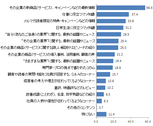 企業が発行するメルマガのコンテンツとしては、どのようなものが関心を持たれるのだろうか。選択式で回答してもらった。最も多かったのは、「その企業の新商品(サービス)、キャンペーンなどの最新情報」で、過半数となった(56.4%)。企業が発行するメルマガのコンテンツとしては最もオーソドックスなものと言える。