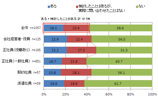 また、職業別に見てみると、「ある」という人の割合にそれほど大きな差はなかったものの、【会社経営者・役員】が最も高く、約5人に1人(21.6%)だった。【正社員(役職あり)】は21.2%で、【正社員(一般社員)】は16.7%だった。