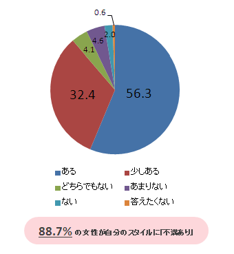 まず、現在の自分の体型・スタイルについて何らかの不満を持っているかどうかを聞いたところ、9割にせまる88.7%の女性が「ある」と回答した(「ある」「少しある」の合計)。「ない」という女性はわずか6.6%(「あまりない」「ない」の合計)。