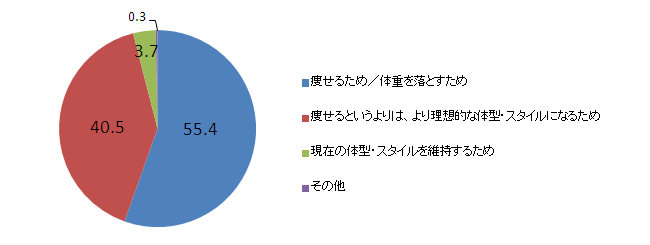 「痩せるため/体重を落とすため」という女性が過半数で55.4%、「痩せるというよりは、より理想的な体型・スタイルになるため」という女性が40.5%だった。また、「現在の体型・スタイルを維持するため」という女性は3.7%だった。