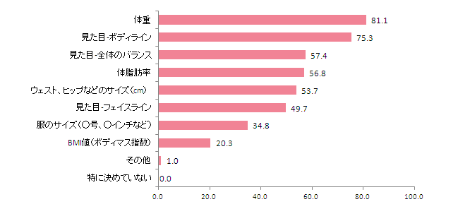 最も多かったのはやはり「体重」(81.1%)で、ダイエット中の女性の8割が1つの目標としている。次に「見た目-ボディライン」(75.3%)、「見た目-全体のバランス」(57.4%)、「体脂肪率」(56.8%)、「ウェスト、ヒップなどのサイズ(cm)」(53.7%)となった。