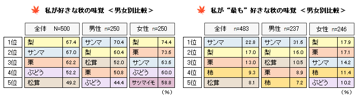 まず、複数選択(Q4-1)で最も多かったのは「梨」(67.4%)。次いで「サンマ」(67.0%)、「栗」(62.2%)、「ぶどう」(52.2%)、「松茸」(49.2%)となった。男女別に比較すると、「梨」「栗」は女性の方がより人気が高く、「サンマ」「松茸」は男性の方が人気が高い。