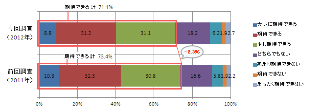 ワクチンの接種状況に関係なくすべての人に、どれくらい予防効果が期待できると思うか聞いてみた。発症の予防については69.2%、罹(かか)った場合の重症化の予防については71.1%と、それぞれ約7割の人が「期待できる」と回答した。(大いに期待できる、期待できる、少し期待できるの合計。)前回の調査と比較してみると、発症の予防が-2.5%、重症化の予防が-2.3%と、わずかだがいずれも低くなっている。
