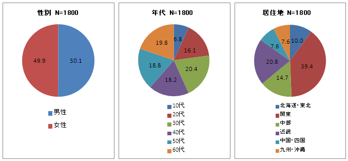 | 割付 | 【性別】 男性:50.1%、女性:49.9% 【年代】 10代:6.8%、20代:16.1%、30代:20.4%、40代:18.2%、50代:18.8%、60代:19.8% |