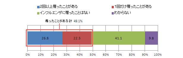 49.1%の人が「ある」という結果だった。そのうち2回以上罹ったことがある人は26.8%、1回だけ罹ったことがある人は22.3%。「ない」という人は41.1%で、「わからない」は9.8%だった。