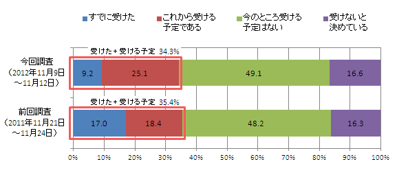 今シーズン(2012年-2013年にかけて)の予防接種について聞いたところ、「今のところ受ける予定はない」という人が最も多く49.1%。「すでに受けた」人は9.2%で1割未満、「これから受ける予定である」は25.1%だった。アンケートを実施した11月上旬時点で接種済みの人はおよそ1割、これから受ける予定の人と合わせても全体の3人に1人程度となっている。前回2011年の調査では11月下旬にアンケートを行ったが、この時は接種済みの人が17.0%となっていた。これから受ける予定の人と合わせると35.4%で、今回の調査とほぼ同じ割合となる。
