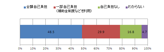 すでに受けた、または受ける予定と回答した人に予防接種の費用について聞いた。48.5%の人が「全額自己負担」と回答、「一部自己負担(補助金制度などを利用)」は29.9%、「自己負担なし」は16.8%、「わからない」が4.7%となった。