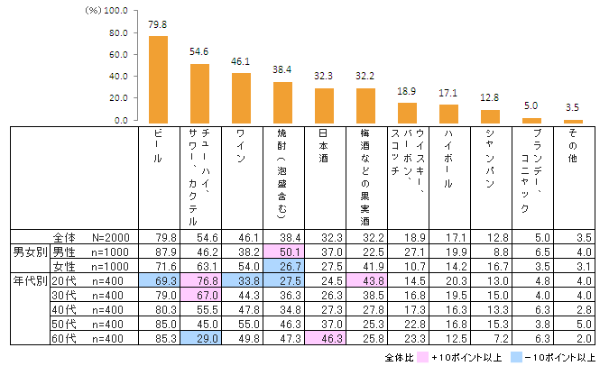まず、お酒を飲む人全体に、どのような種類のお酒を飲んでいるか答えてもらった。全体で最も多いのは「ビール」で、79.8%。男性では87.9%と9割近く、女性も71.6%で7割となった。年代別でみると20代の割合がやや低くなっており(69.3%)、50代(85.0%)・60代(85.3%)と比べると15ポイントの差がある。「ビール」は年代が高い程飲む人の割合が高くなるが、2番目に多かった「チューハイ、サワー、カクテル」(54.6%)は、年代が若いほど飲む人の割合が高いという結果だった。