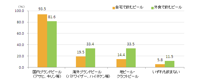 続いて、ビールを飲む人に、自宅と外食それぞれについて、どのようなビールを飲んでいるのかをたずねた。「国内ブランドビール」が圧倒的に多く、自宅では9割以上、外食でも8割を超えた。「海外ブランドビール」は、自宅よりも外食で飲む人の方がやや多く、自宅で飲む人は19.5%、外食では33.4%となっている。自宅と外食両方、またはいずれかで海外ブランドビールを飲む人は、ビールを飲む人全体の42.2%という結果になった。「地ビール・クラフトビール」については、自宅で飲む人が14.4%、外食で飲む人が33.5%となっている。