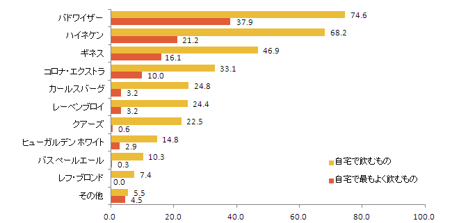 海外ブランドビールを自宅で飲んでいる人に、飲んでいる銘柄と、その中で最もよく飲む銘柄を聞いた。