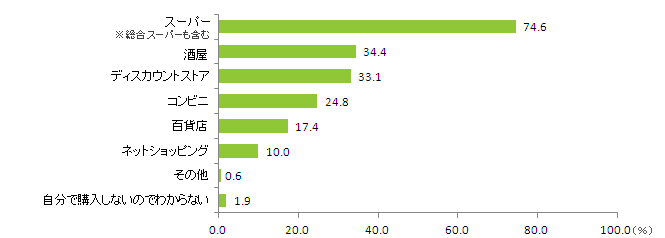 続けて、自宅で飲む海外ブランドビールの購入場所を聞いた。「スーパー(総合スーパーも含む)」が74.6%と最も多く、他には「酒屋」(34.4%)、「ディスカウントストア」(33.1%)、「コンビニ」(24.8%)、「百貨店」(17.4%)となった。「ネットショッピング」で購入している人は10.0%だった。また、「自分で購入しないのでわからない」という人が1.9%いた。