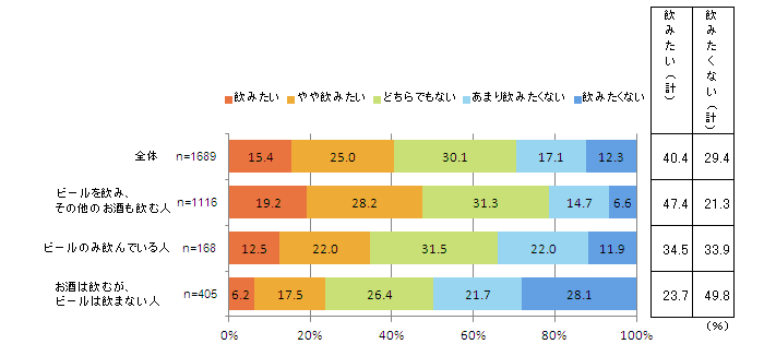 自宅で海外ブランドビールを飲むことがない人に、今後飲んでみたいと思うかどうかをたずねた。すると、40.4%の人が「飲みたい」と回答した(やや飲みたいを含む)。「どちらでもない」は30.1%、「飲みたくない」(あまり飲みたくないを含む)は29.4%という結果になった。